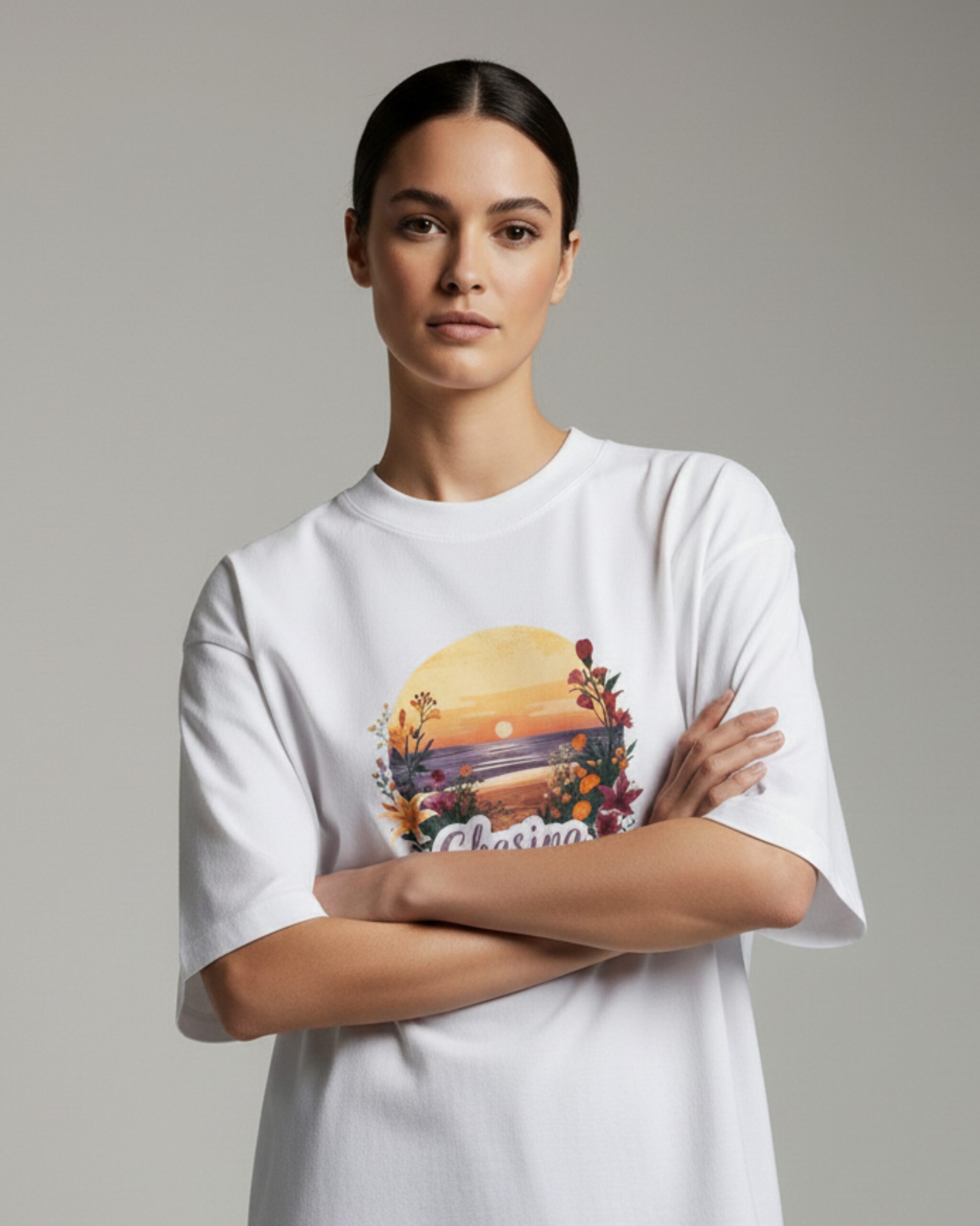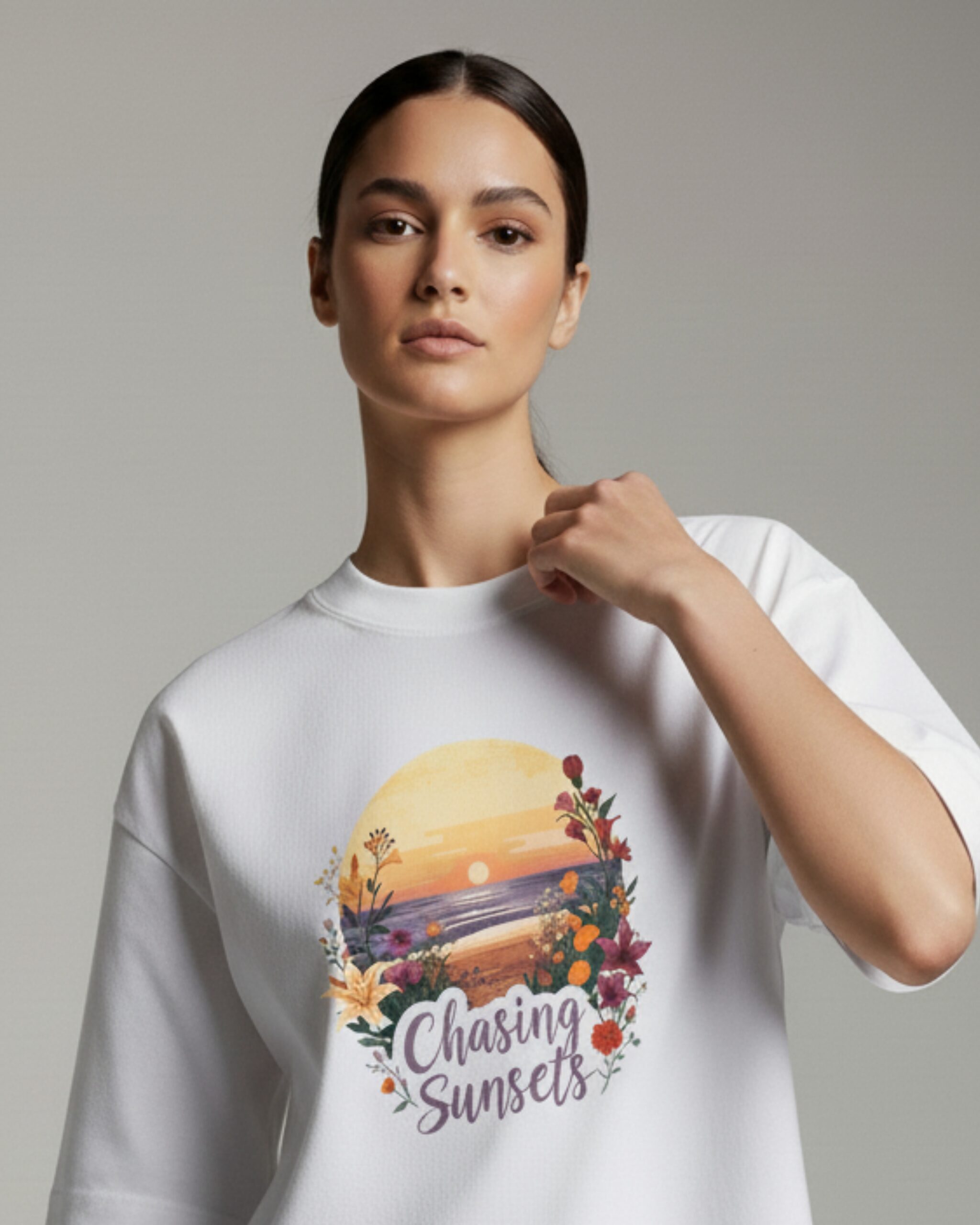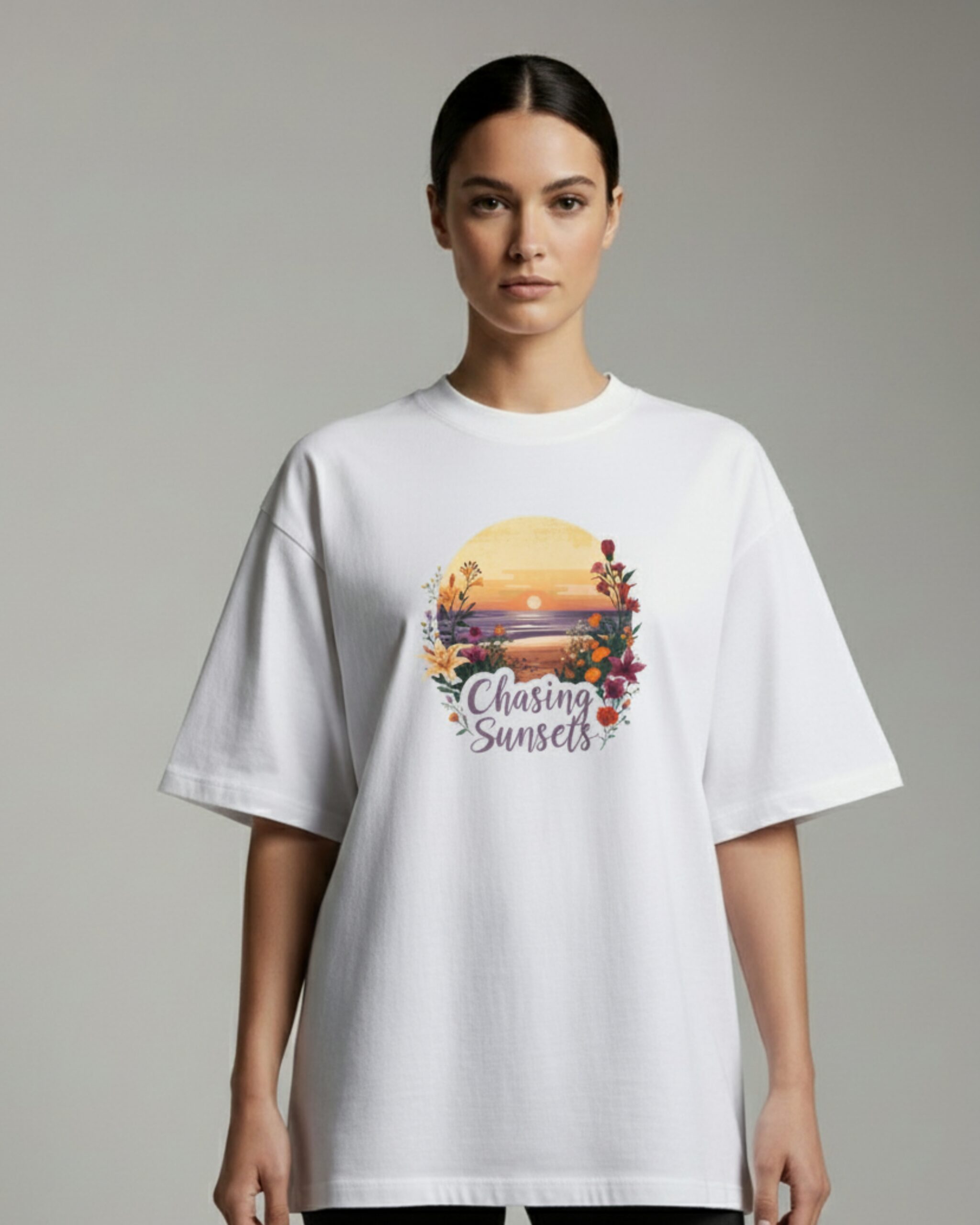 Every detail—from the colorful “Chasing Sunsets” graphic featuring a stunning sunset to the surrounding floral accents—has been thoughtfully executed to blend natural beauty with a sense of adventure, creating a timeless piece that resonates with nature lovers and wanderers alike.
