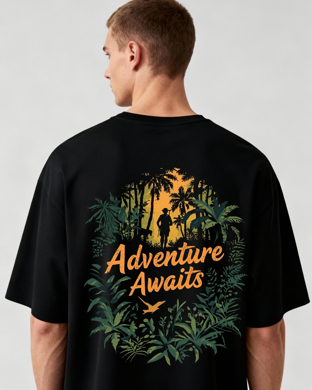 This bold black tee features a striking jungle-inspired graphic on the front, layered with lush green foliage and warm sunset tones, carrying the bold statement “Echoes of the Earth.” The back design, with the inspiring words “Adventure Awaits” set against the silhouette of a lone traveler walking into the wild, captures the essence of wanderlust and discovery. Crafted from premium cotton, this shirt blends comfort, durability, and a story of connection to nature.