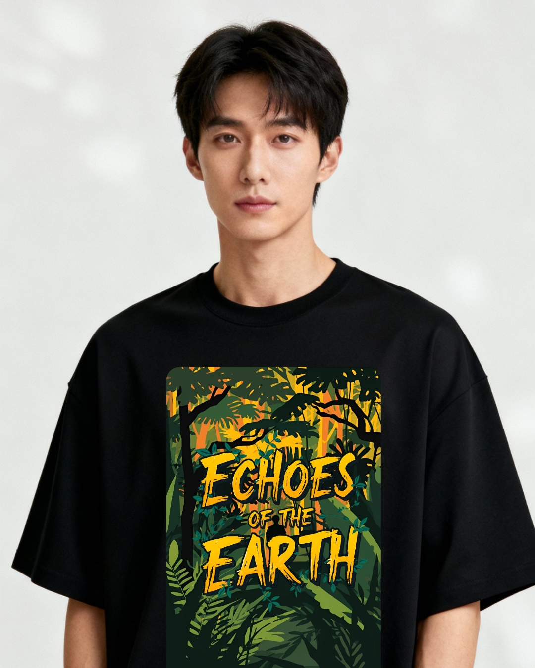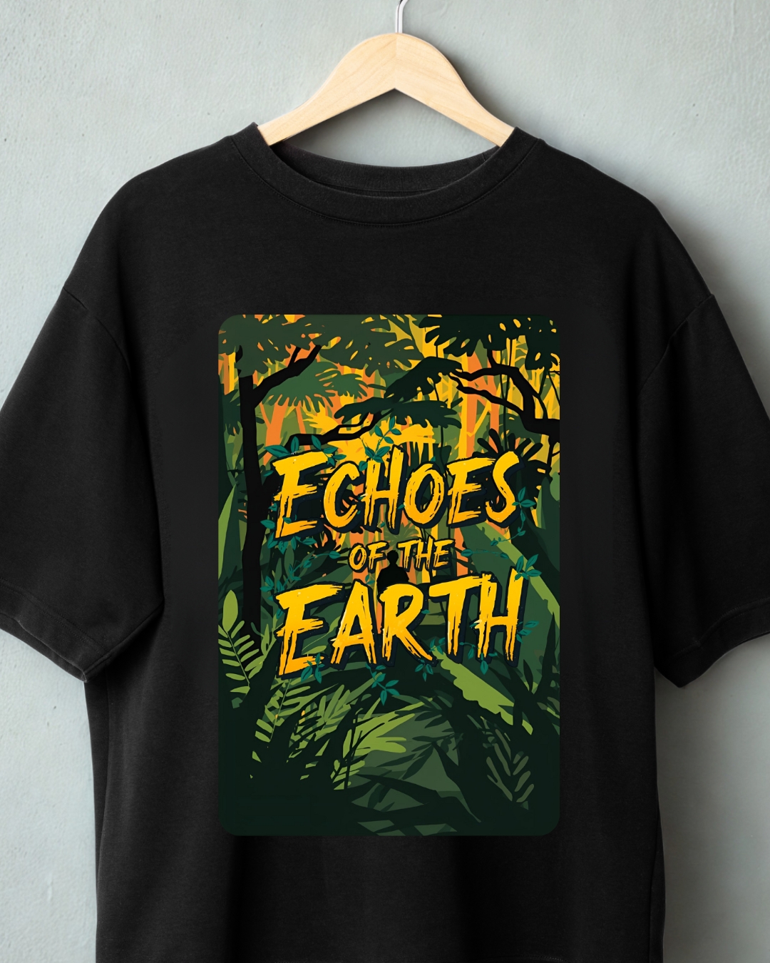 The “Echoes of the Earth” T-shirt celebrates the harmony of adventure and nature. The front design features an immersive jungle scene with bold typography, reminding us to listen to the voice of the earth. On the back, the phrase “Adventure Awaits” is paired with a silhouette walking into a glowing horizon, symbolizing the endless opportunities for exploration.
