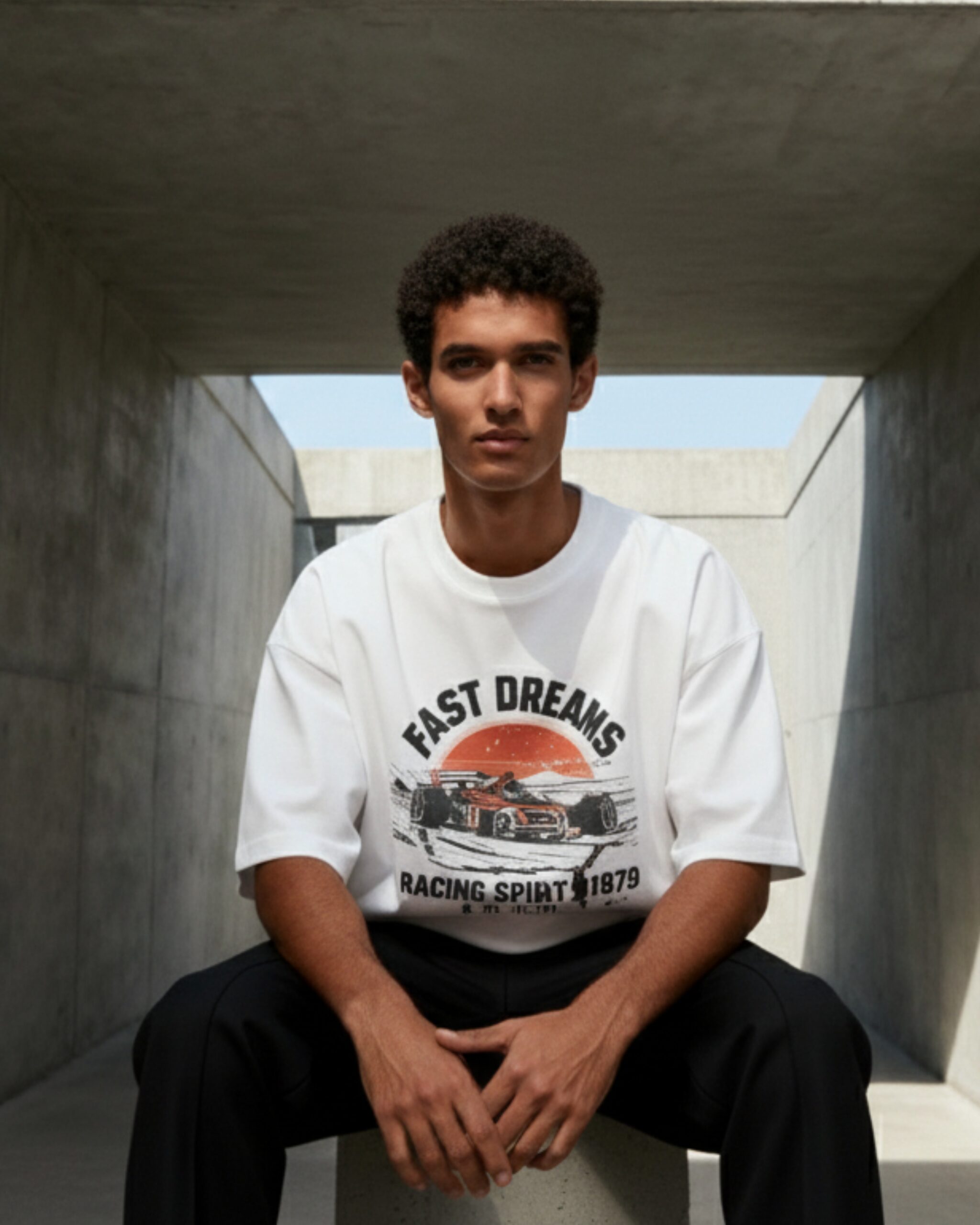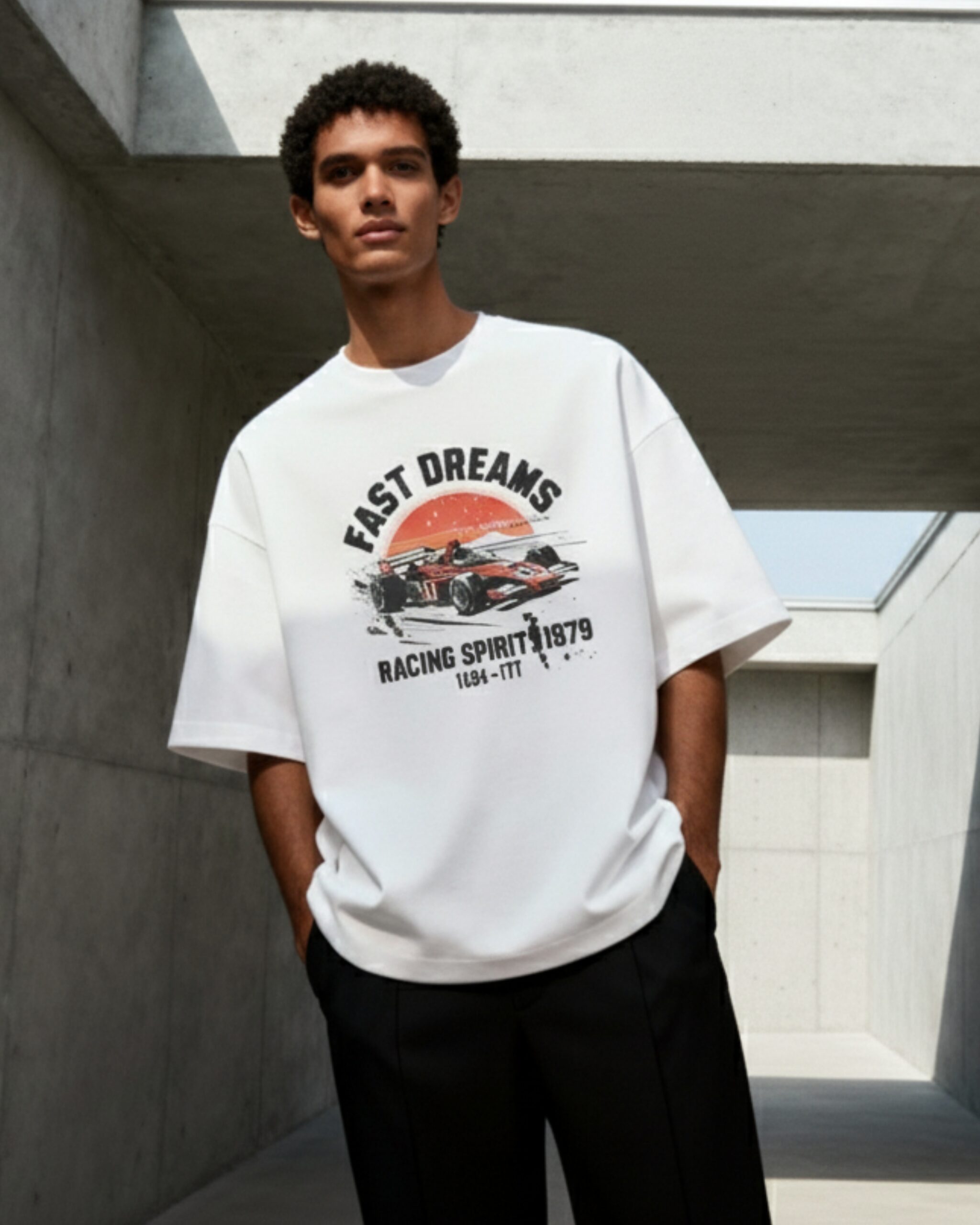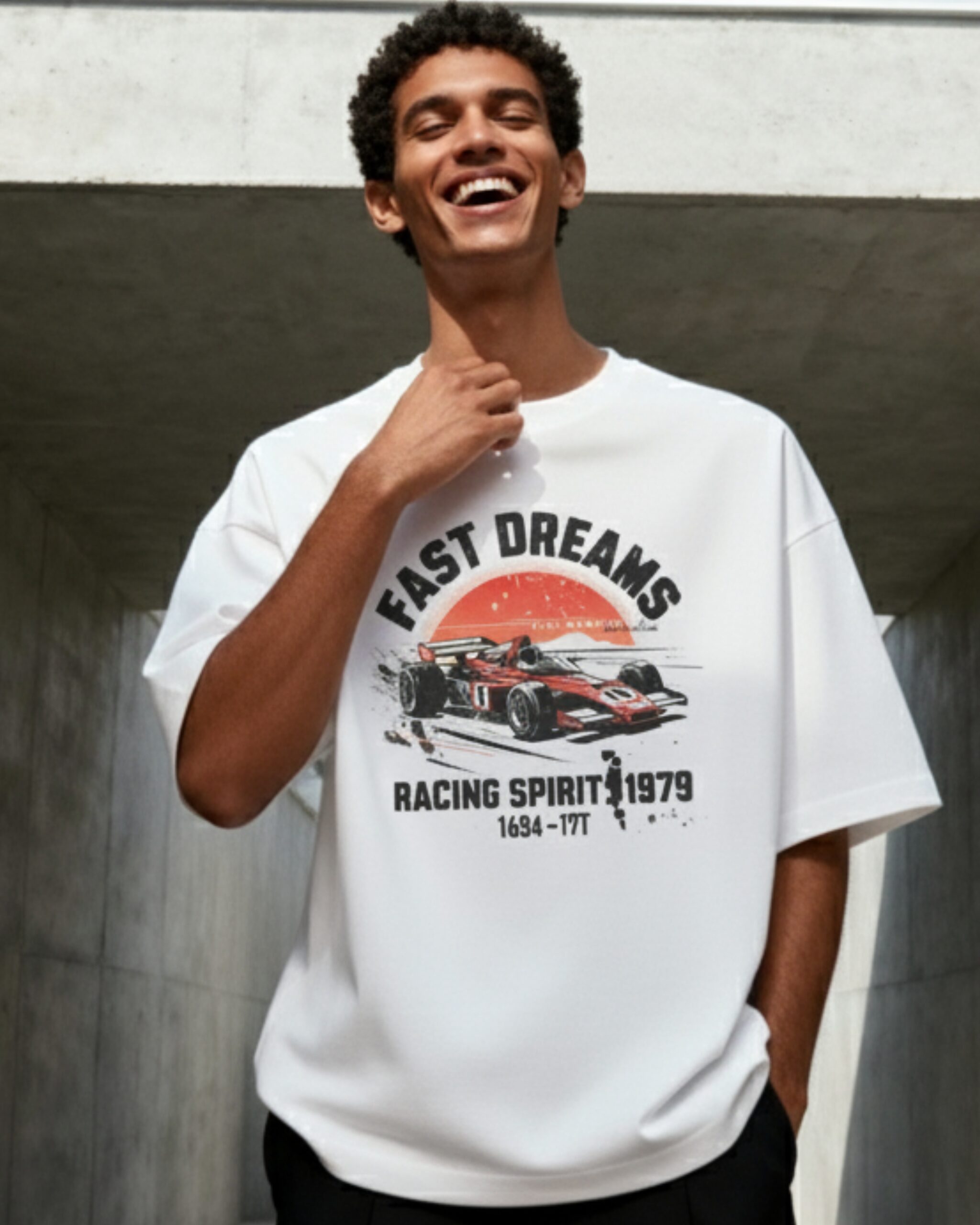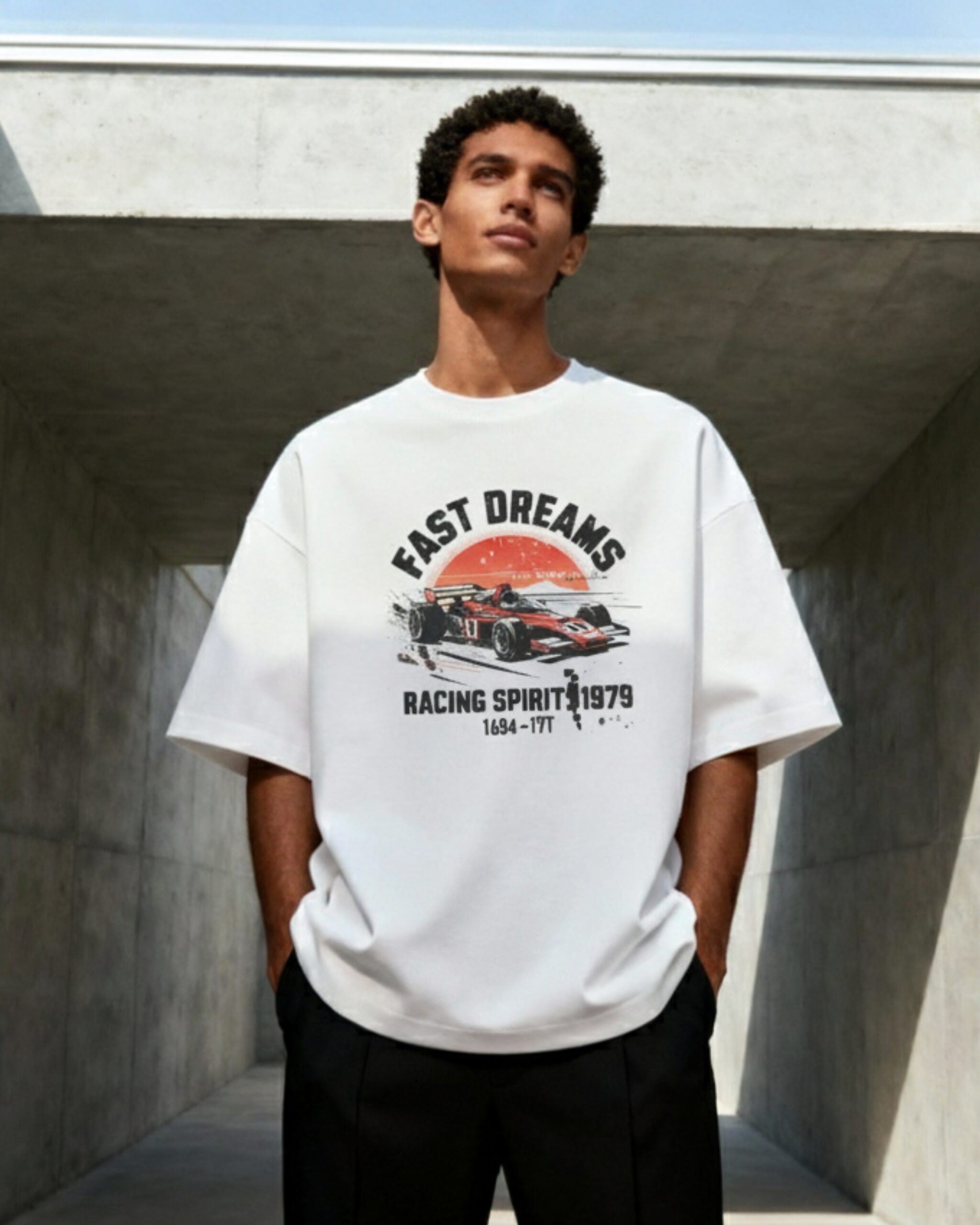 Details: “FAST DREAMS” graphic featuring a racing car, “RACING SPIRIT 1979” phrase