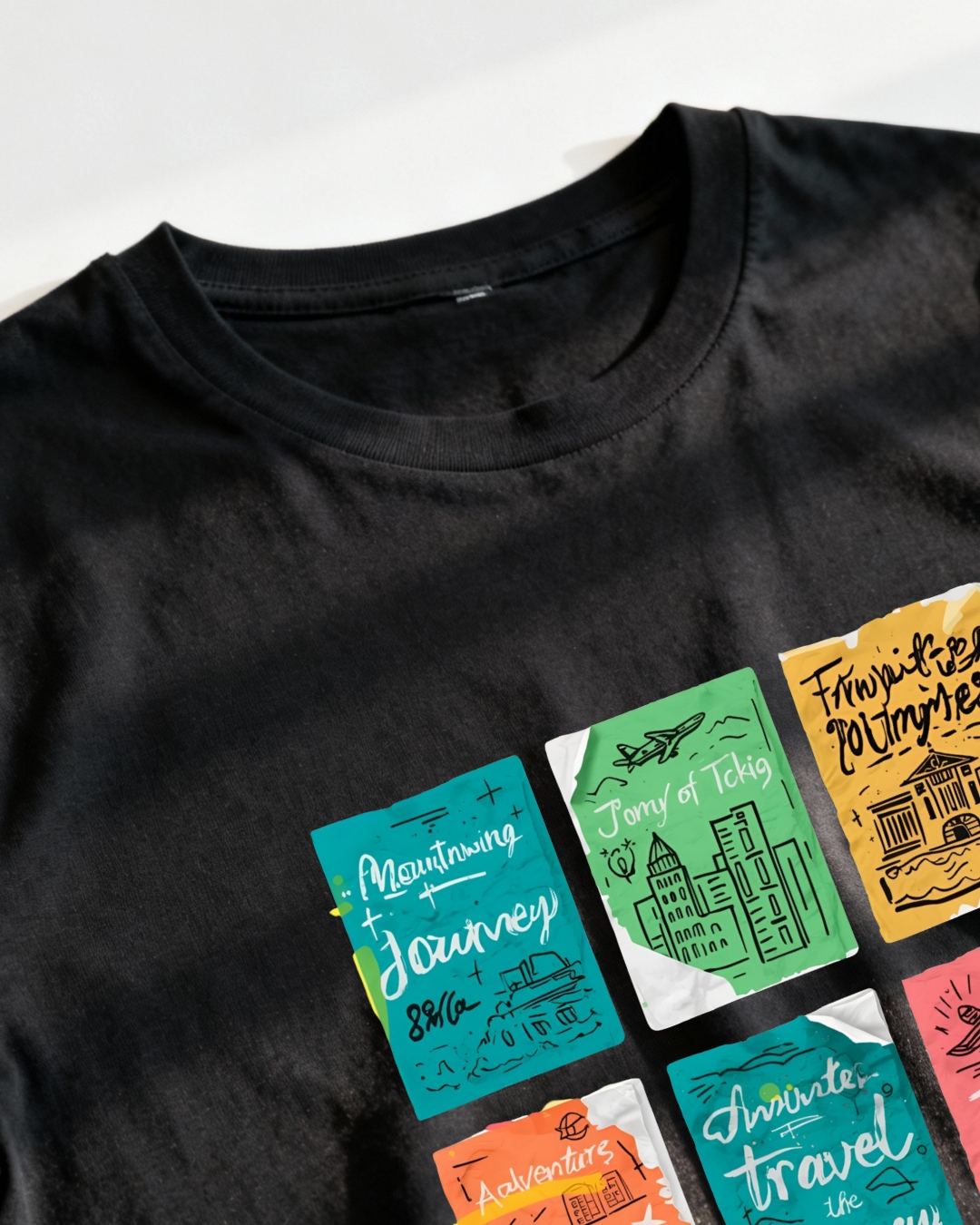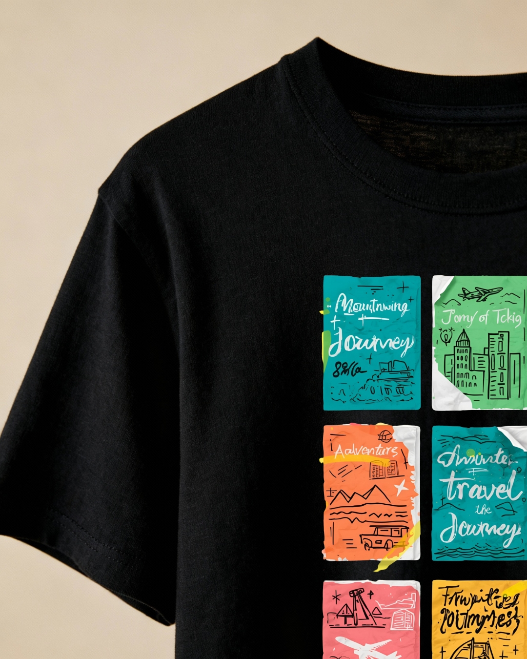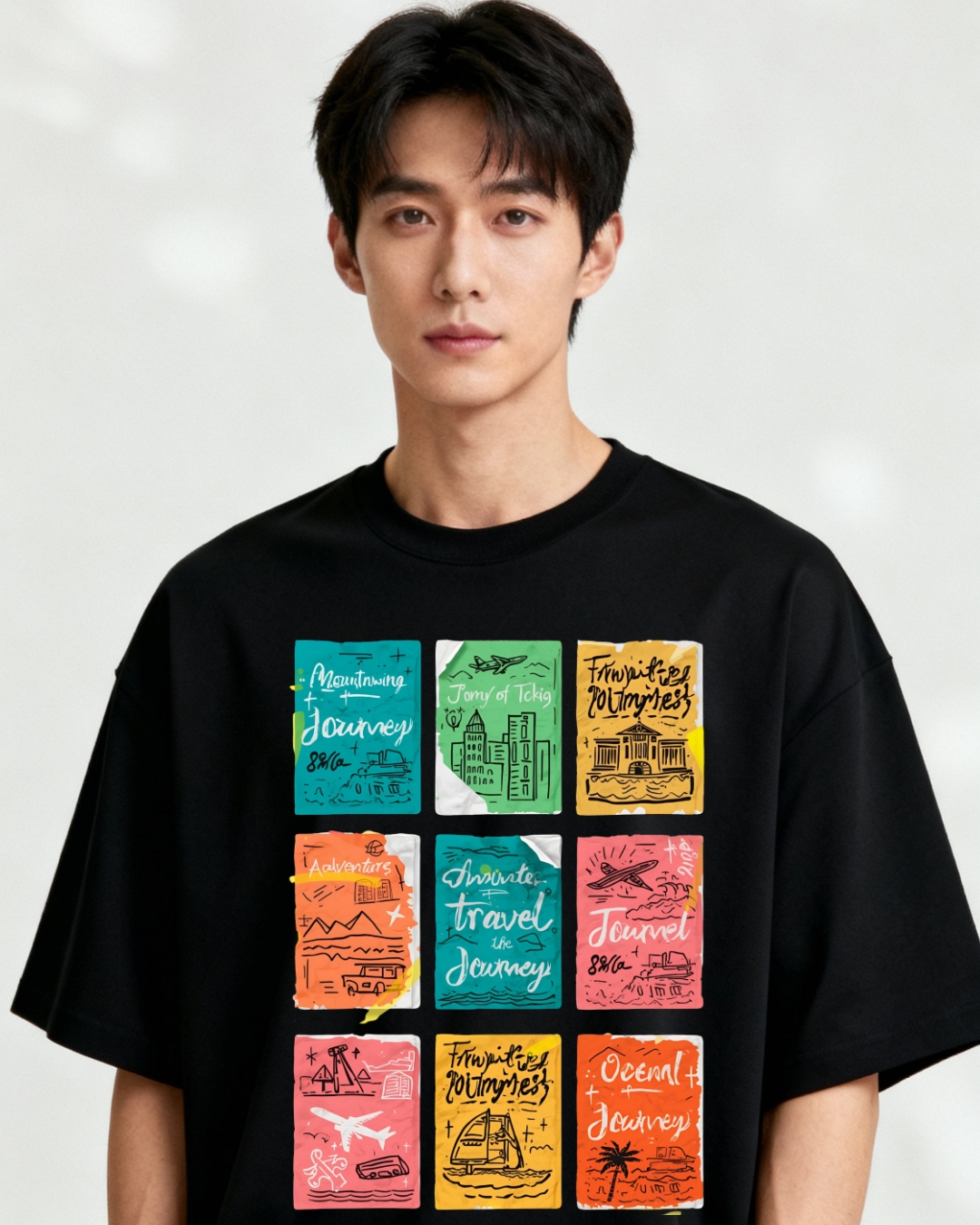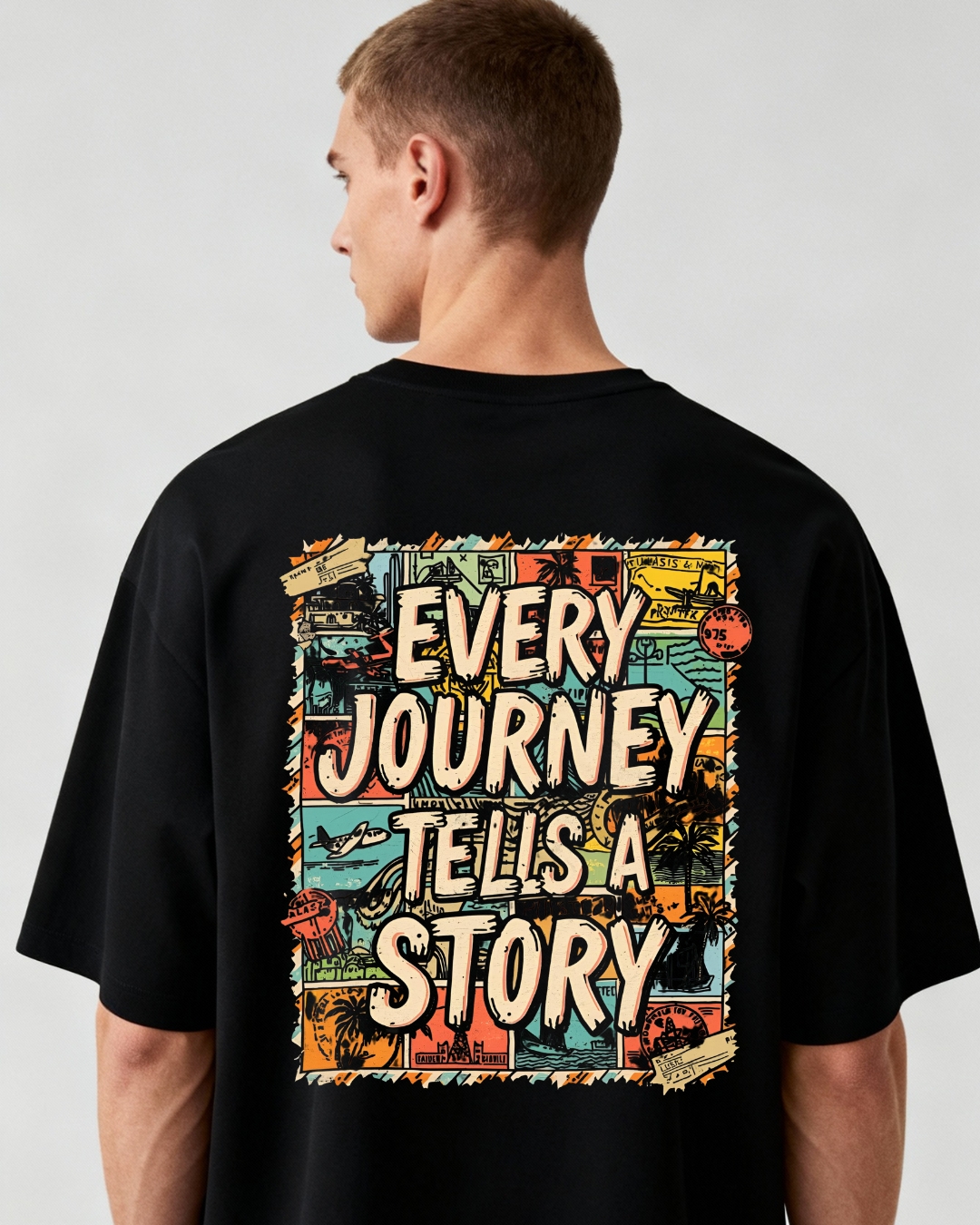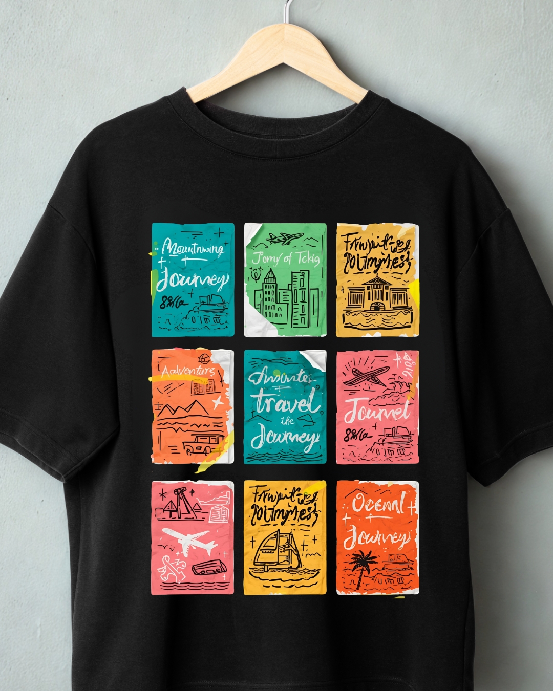 This bold black tee features a striking collage of colorful travel postcards on the front, each capturing unique experiences—mountain treks, ocean voyages, city skylines, and aerial adventures. The back design, carrying the quote “Every Journey Tells a Story” surrounded by postcard motifs, travel stamps, and sketch-style doodles, reflects the beauty of collecting memories along the way. Crafted from premium cotton, this shirt blends durability, comfort, and a spirit of wanderlust.
