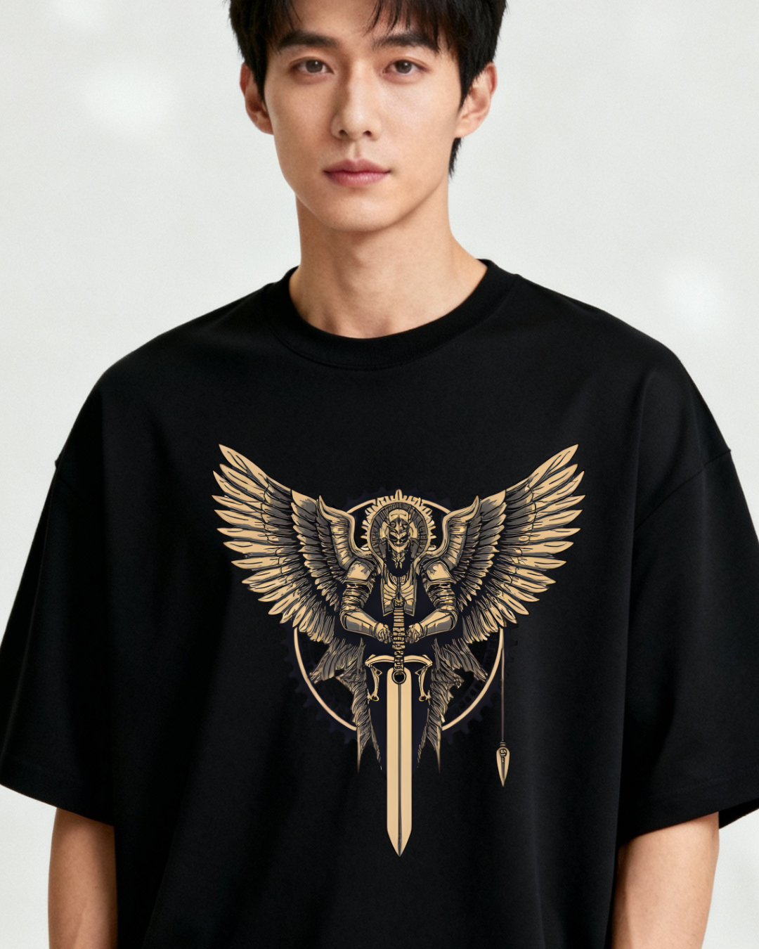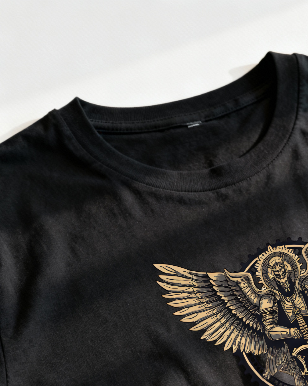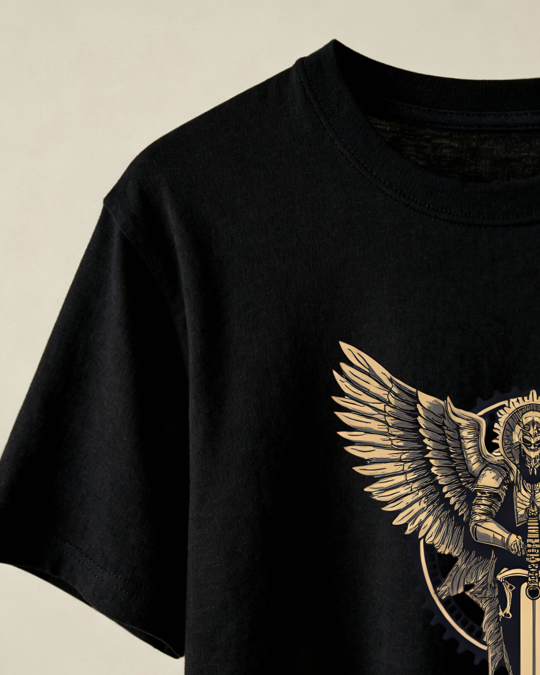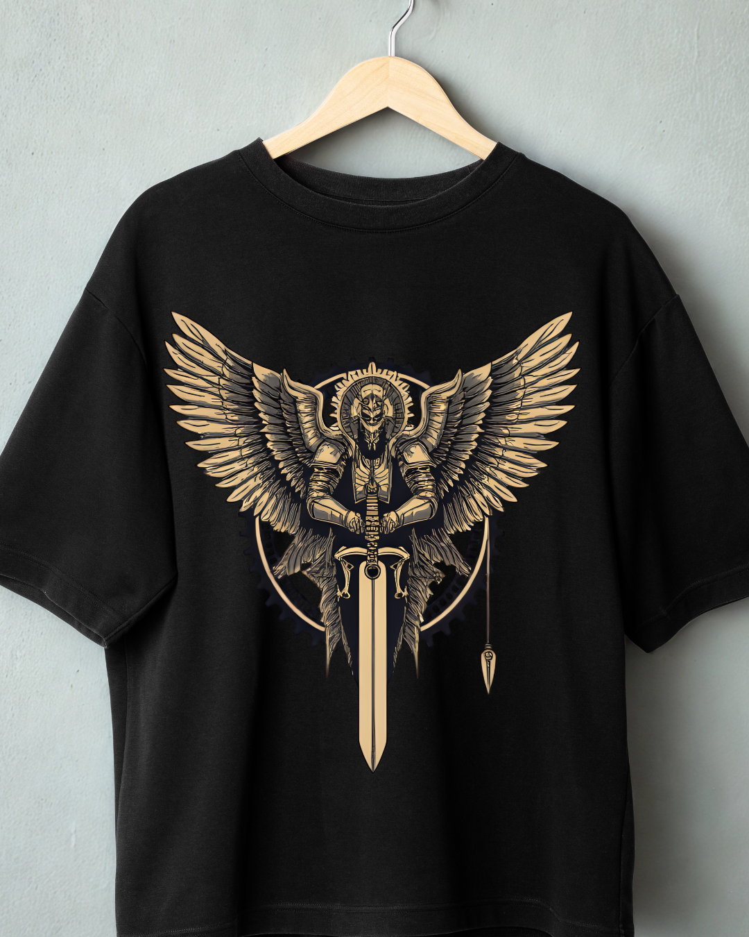 Inspired by the relentless pursuit of greatness, this black tee features a powerful graphic on the front, showcasing a warrior with angelic wings, holding a sword of strength. The back boldly carries the message “RISE BEYOND LIMITS,” calling you to break barriers and push beyond your boundaries. Crafted from a premium cotton blend fabric, it ensures both comfort and breathability, empowering you to take on any challenge with confidence.