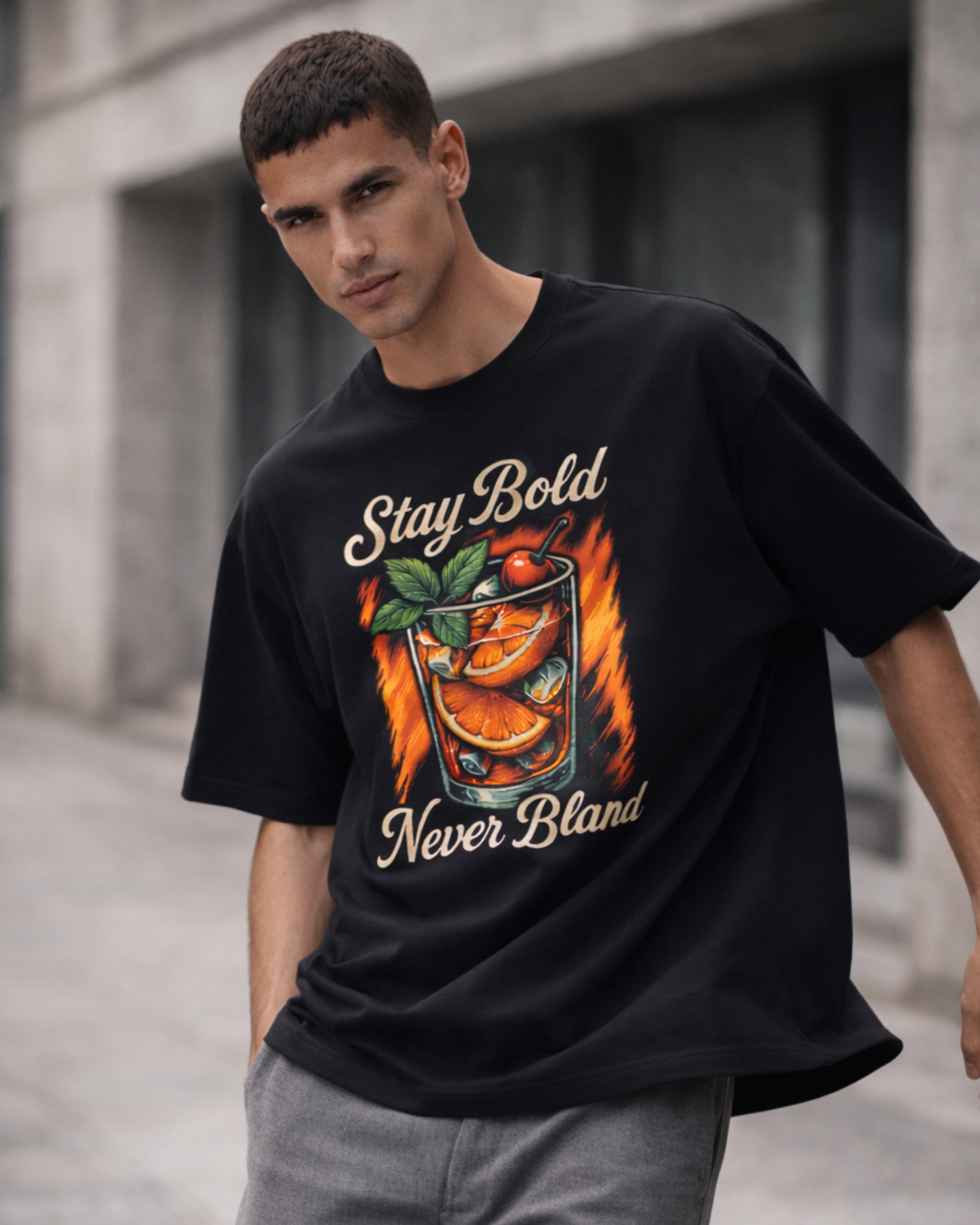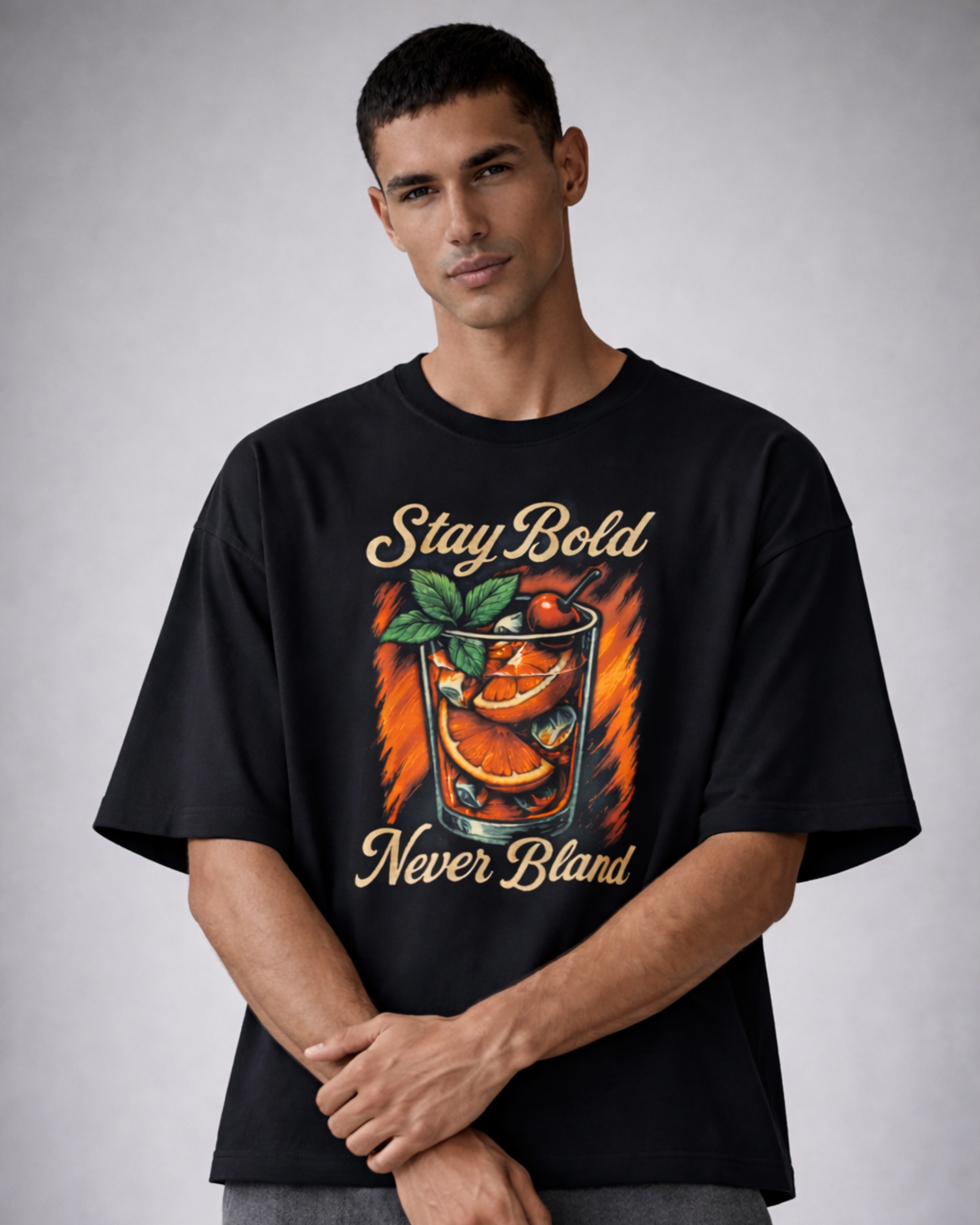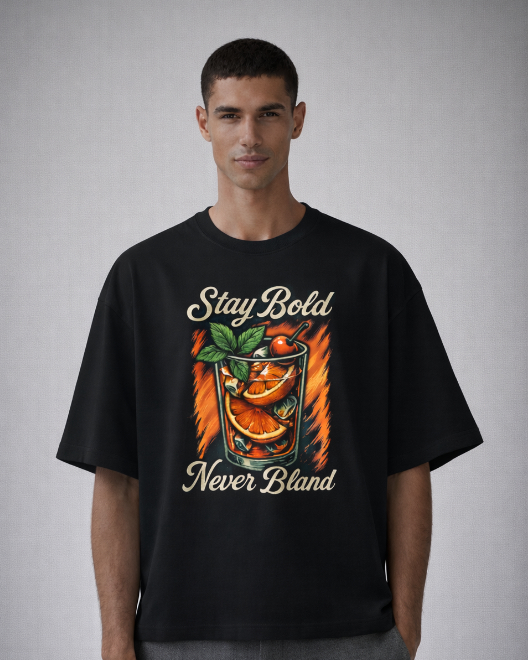 The design features a detailed illustration of a refreshing citrus drink filled with orange slices, mint leaves, ice cubes, and a cherry garnish—set against dynamic flame-inspired strokes. The phrases “Stay Bold” and “Never Bland” frame the artwork in vintage-style script, reinforcing the message of individuality and fearless flavor. The combination of warm oranges, fresh greens, and strong typography creates a lively yet balanced visual impact.