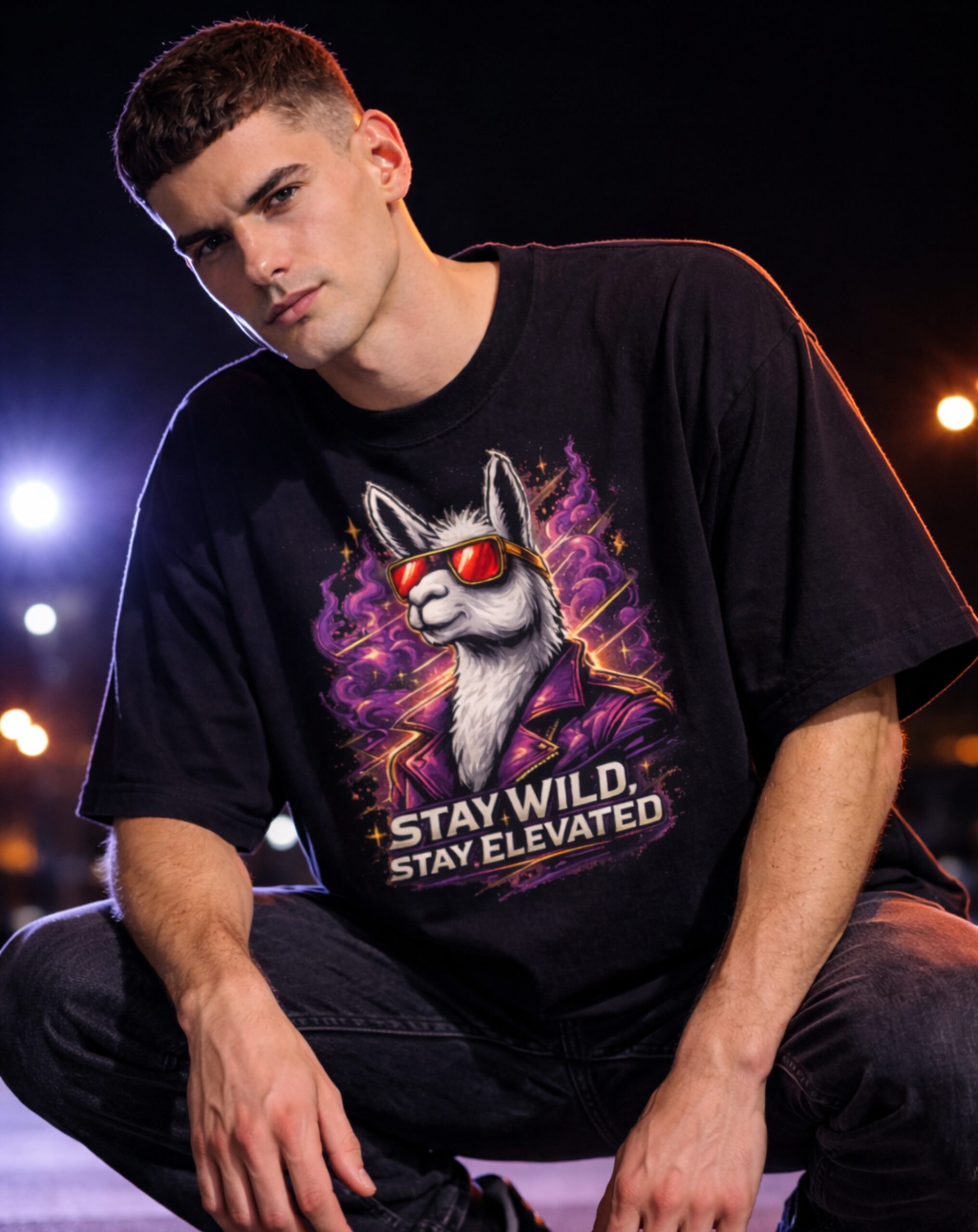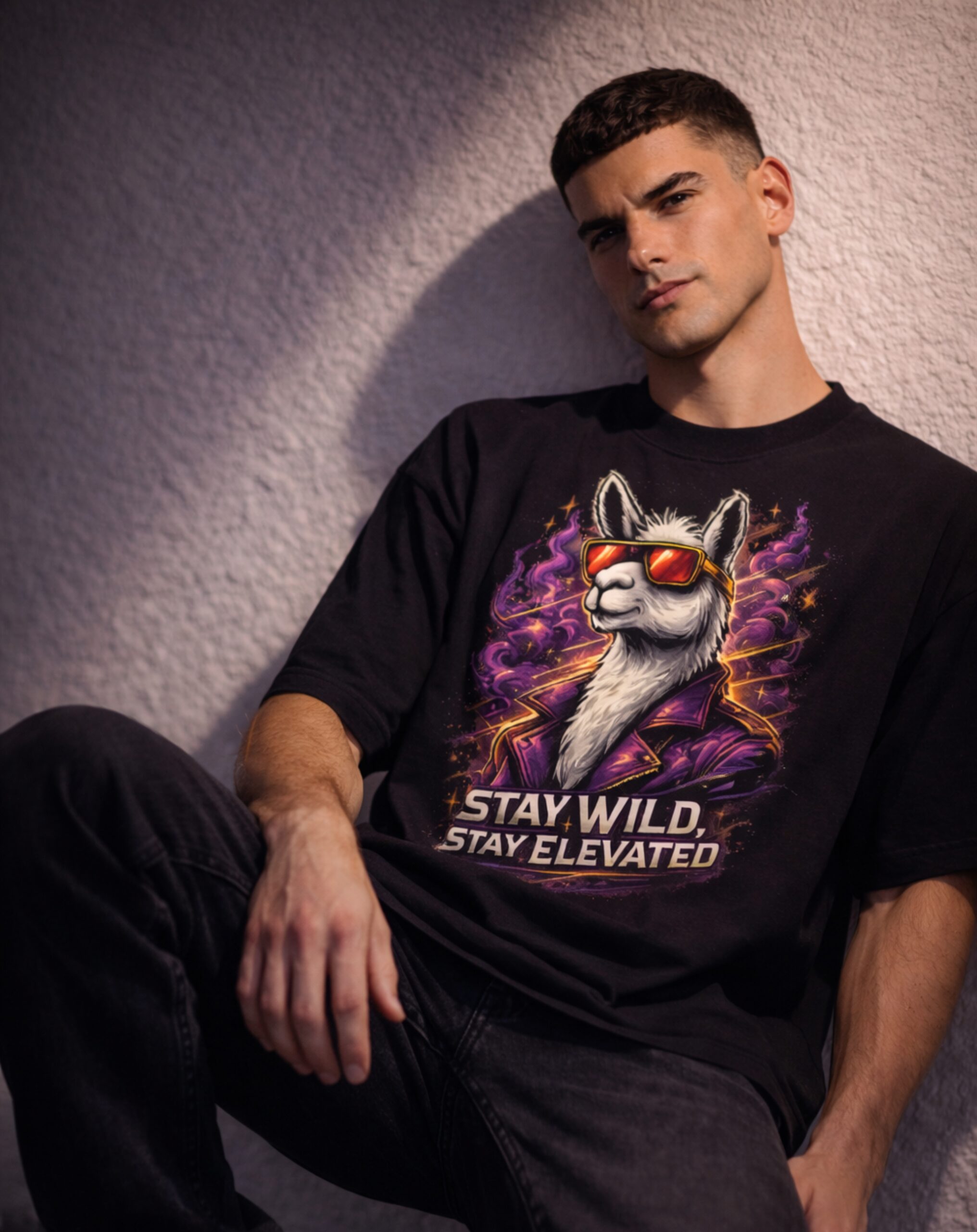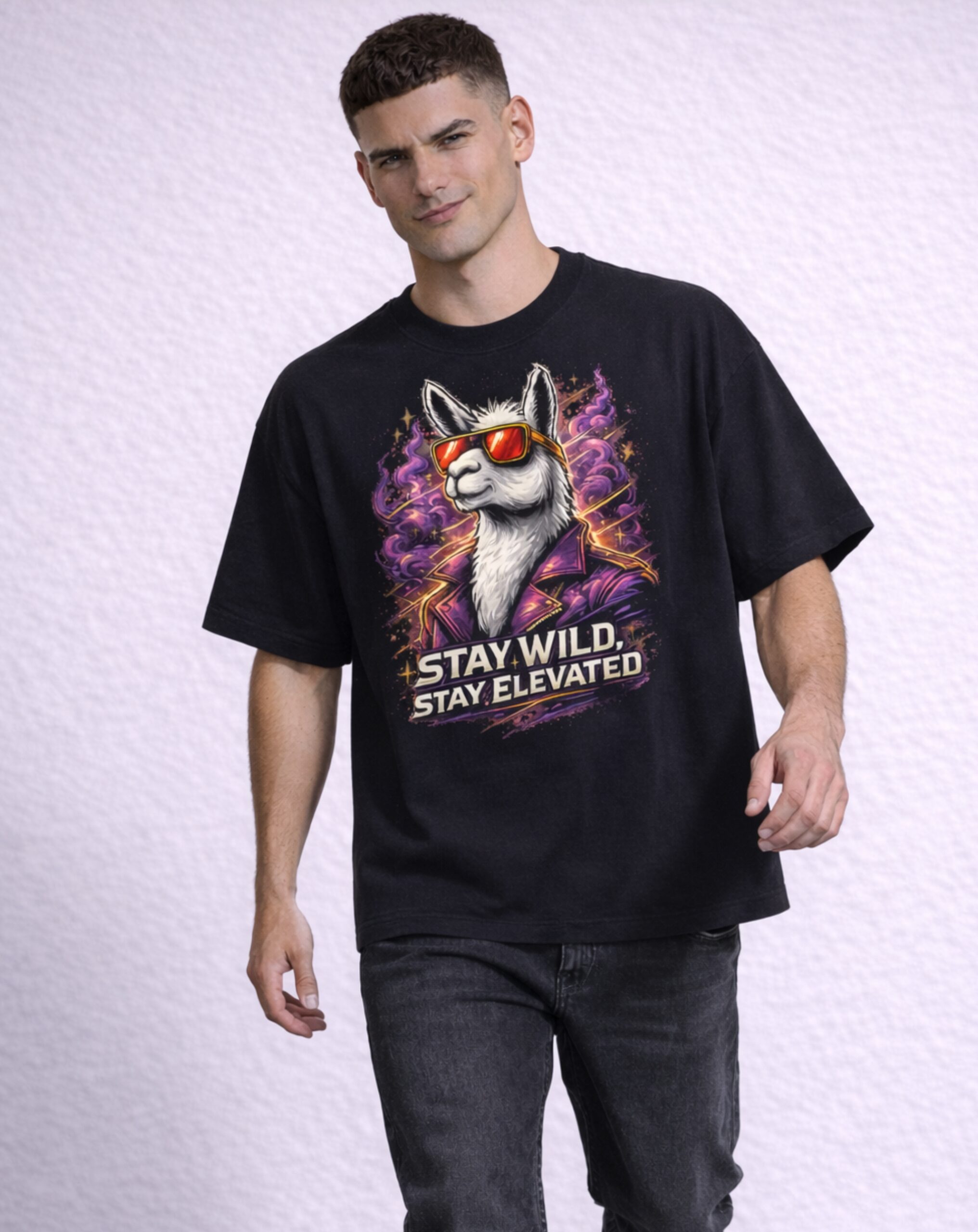 The design features a confident llama styled in a sharp purple jacket and reflective red sunglasses, surrounded by cosmic smoke swirls and radiant accents. The statement “STAY WILD, STAY ELEVATED” anchors the composition below, reinforcing the spirit of fearless self-expression. The interplay between street-style fashion and surreal cosmic energy creates a bold yet playful visual narrative.