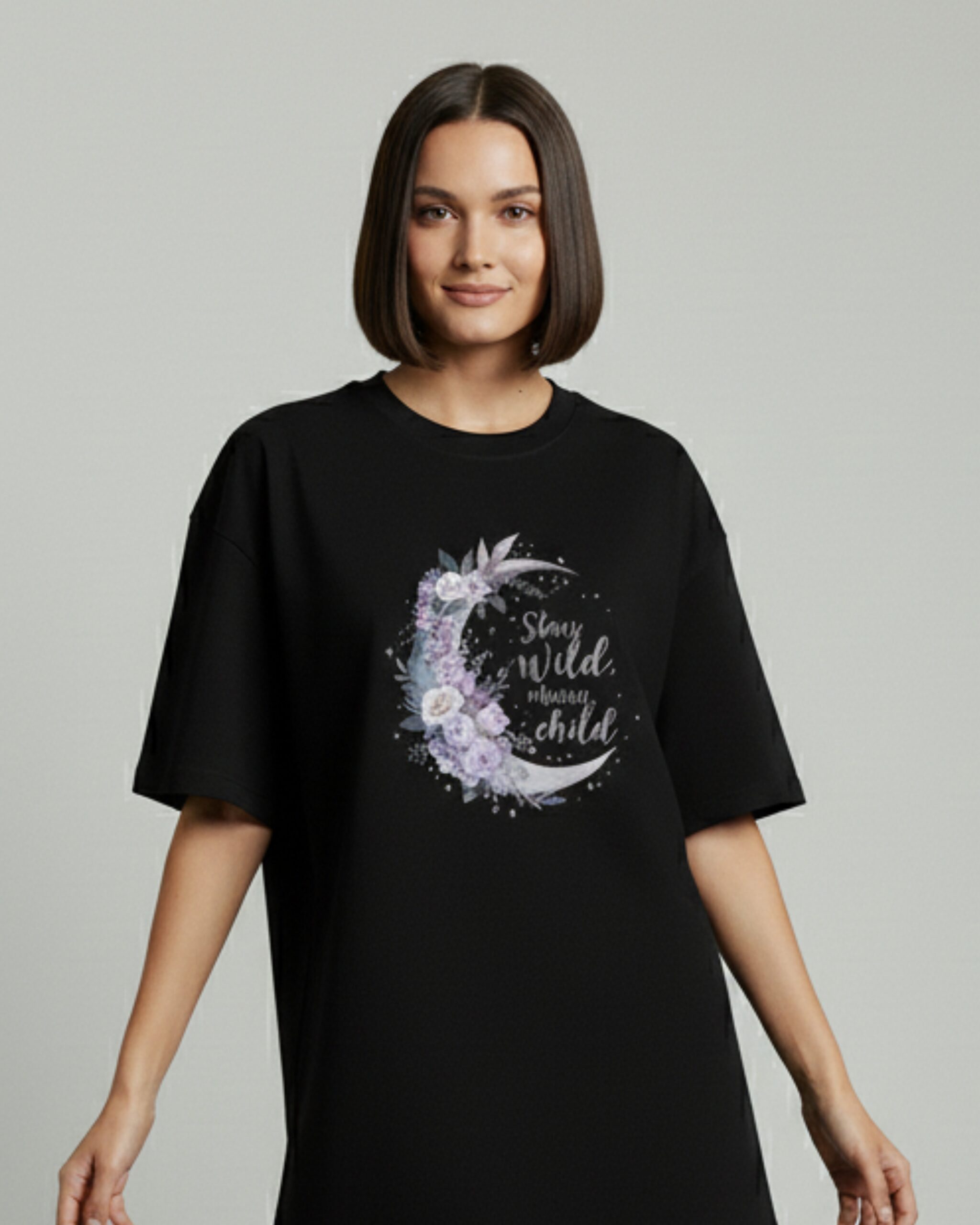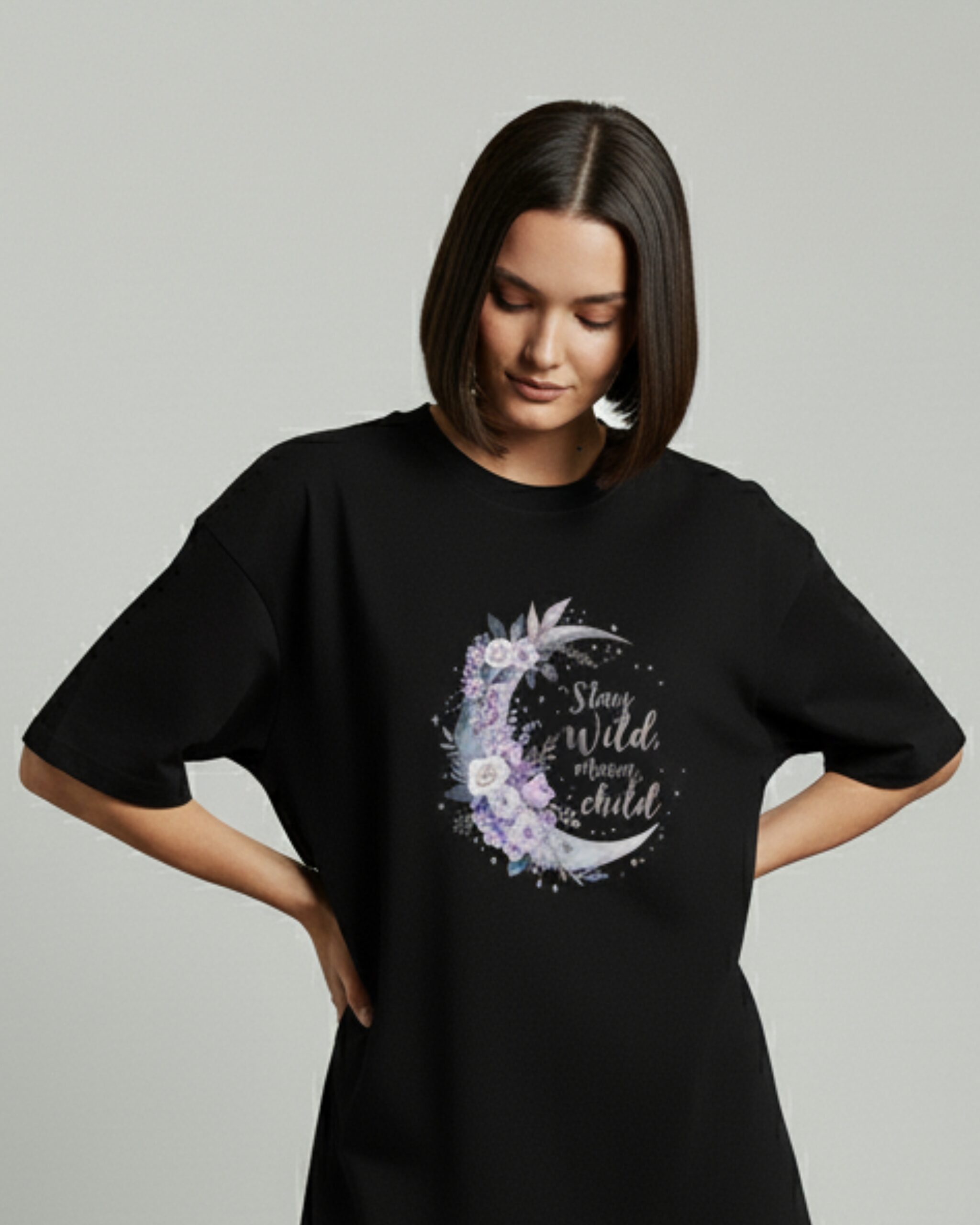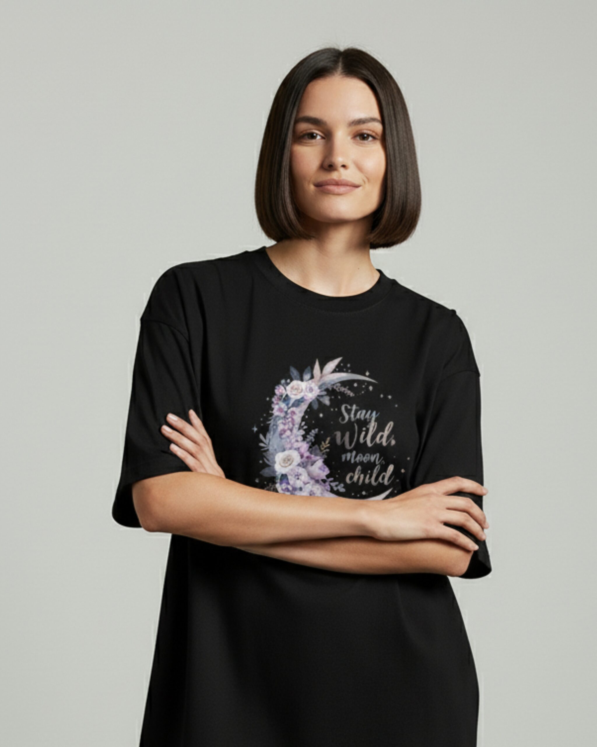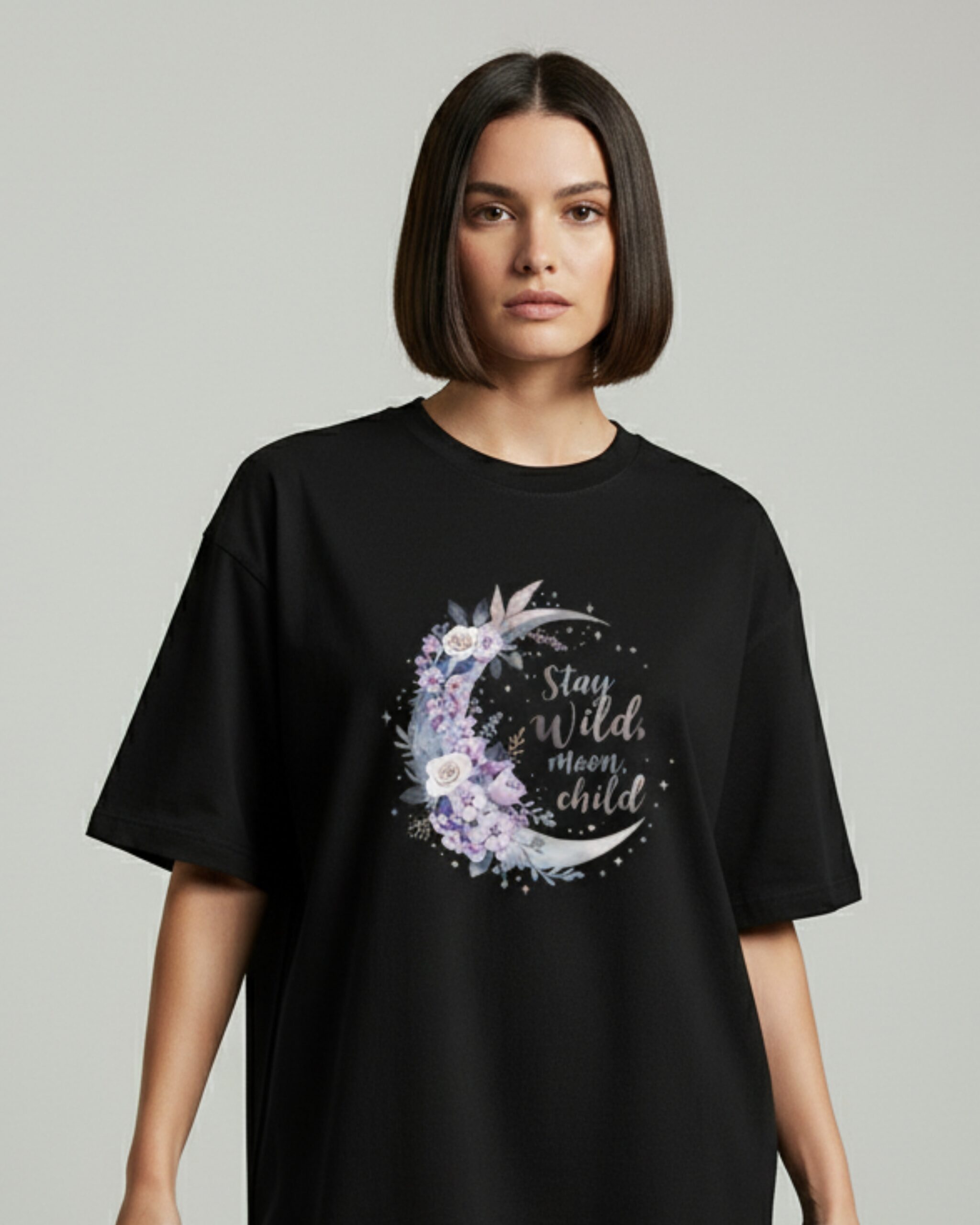 The “Stay Wild, Moon Child” t-shirt was designed for the dreamers, the rebels, and the free spirits who live by the rhythms of nature and the moon. Featuring a crescent moon adorned with delicate lavender and rose flowers, the t-shirt’s graphic is a reminder to stay true to yourself and embrace your untamed spirit.