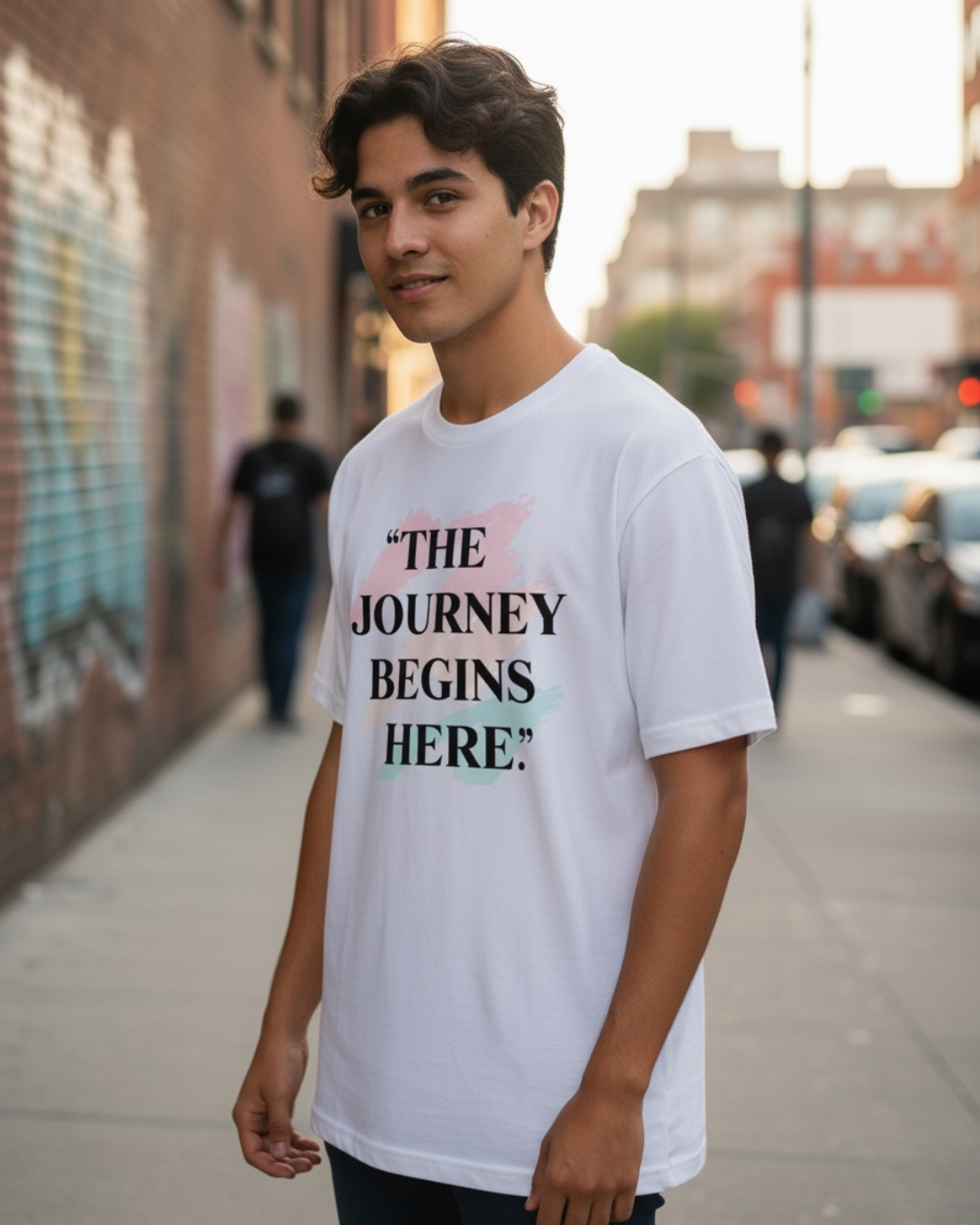 The “The Journey Begins Here” t-shirt stands for more than just fashion—it’s a symbol of self-expression, confidence, and embracing the journey ahead.