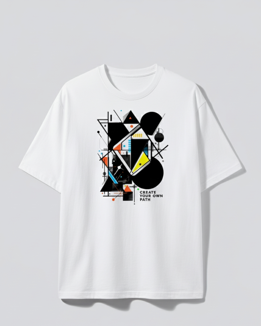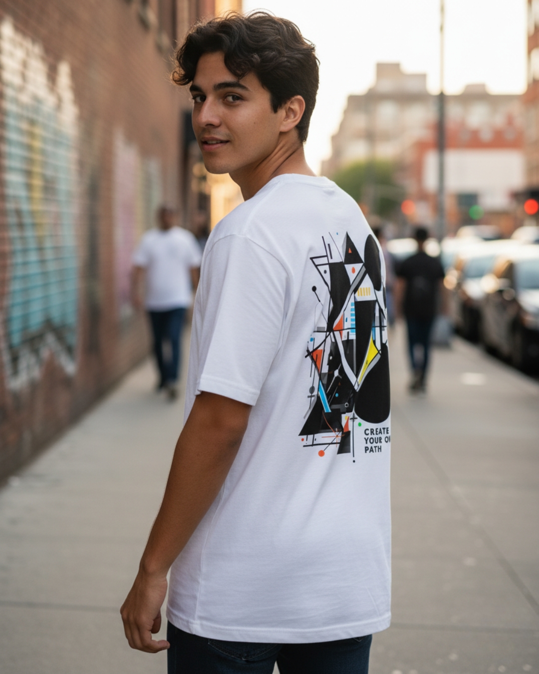 Inspired by modern abstract design and redefined through Indian craftsmanship.This premium white t-shirt is crafted from 100% high-grade cotton, offering exceptional softness, breathability, and comfort. Its clean, fluid lines and bold geometric accents reflect contemporary design principles, while the natural fabric and durable construction ensure long-lasting performance.
