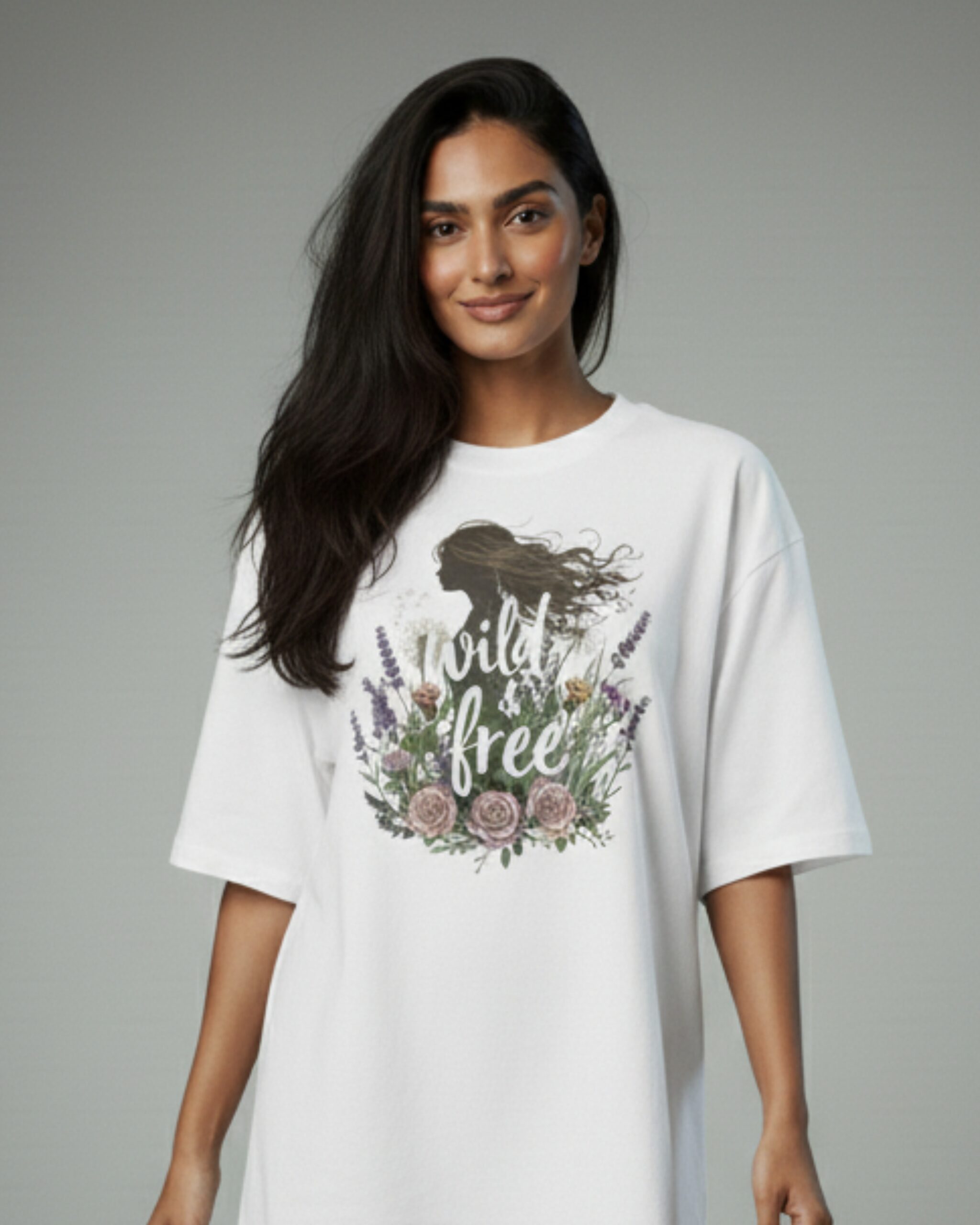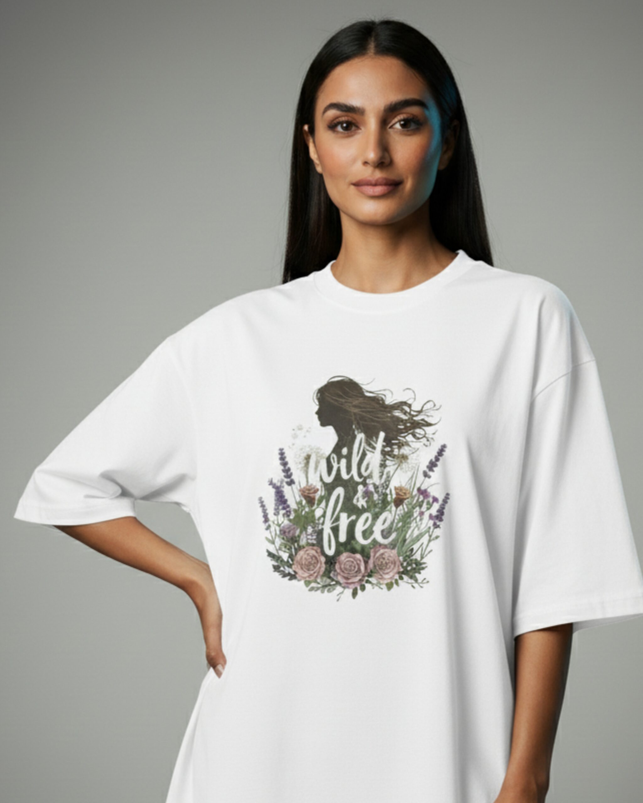 Inspired by the untamed spirit of nature and freedom, this premium white t-shirt is crafted from 100% high-grade French Terry cotton, ensuring exceptional softness, breathability, and all-day comfort. Its dynamic design, featuring a silhouette of a free-spirited woman surrounded by a beautiful floral arrangement, captures the essence of independence and natural beauty, while the durable construction ensures long-lasting wear.