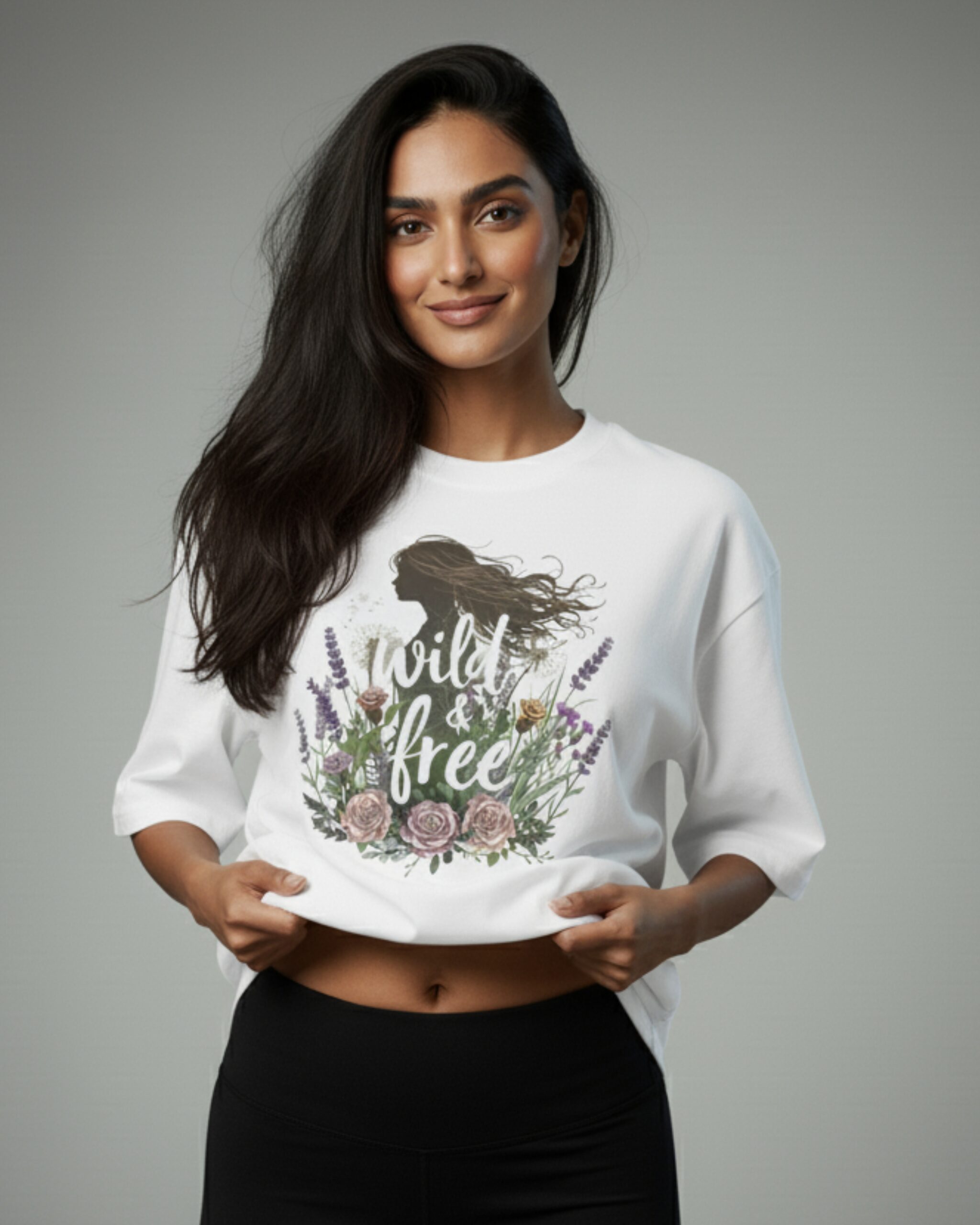 Details: “Wild & Free” graphic with floral elements and a free-spirited woman’s silhouette